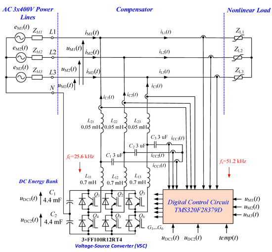 In Figure 5, a sample simplified schematic of an Active Power Filter (APF) is presented, which has been a subject of interest in previous studies by the author [23,28]. The APF is equipped with an LCL low-pass filter at the inverter output. This configuration was tested by the author using both analog and digital simulation tools, initially employing an L filter and subsequently an LCL filter. For improved stabilization of output currents iC1(t), iC2(t), and iC3(t), an algorithm version was adopted that requires additional feedback from the currents of the capacitors iCC1(t), iCC2(t), and iCC3(t) in the LCL output system.