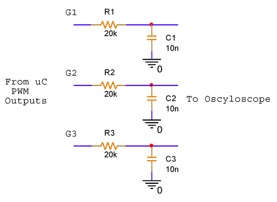 Figure 6 shows a very simple RC low-pass filter circuit designed for observing PWM signals that control the gate of the inverter transistors. The cutoff frequency of the RC filters should be selected based on the switching frequency of the transistors. In the author’s practice, such circuits are incorporated into every control system he develops. This configuration allows for the rapid verification of waveforms generated by the PWM outputs using an oscilloscope.