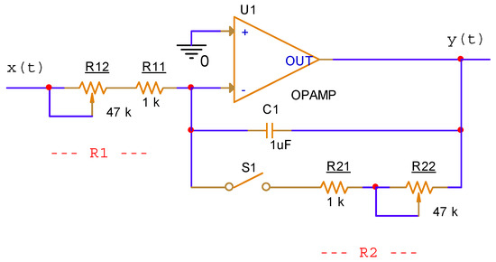The diagram of the proposed first-order simulator is shown in Figure 7. Depending on the position of switch S1, the circuit can operate as either an integrator or an averaging circuit. Potentiometers R12 and R21 allow for the adjustment of the desired time constant.