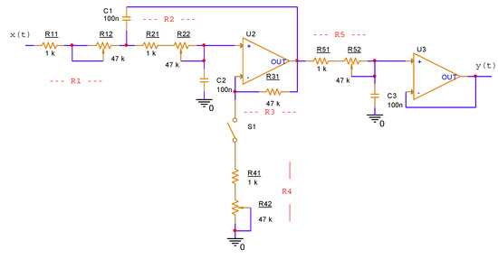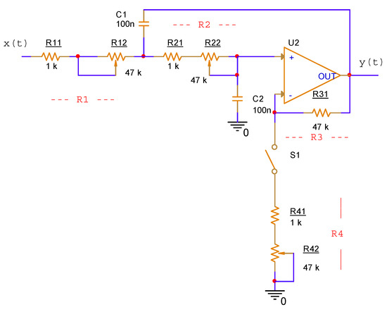 To avoid expanding the transfer function equations, simplifications were applied in Figure 8, Figure 9 and Figure 10. For example, in Figure 7, the value of resistor R1 (in red) represents the sum of resistors R11 and R12, and the value of resistor R2 (in red) represents the combined values of resistors R21 and R22. The transfer functions refer specifically to the values of the resistors shown in red.