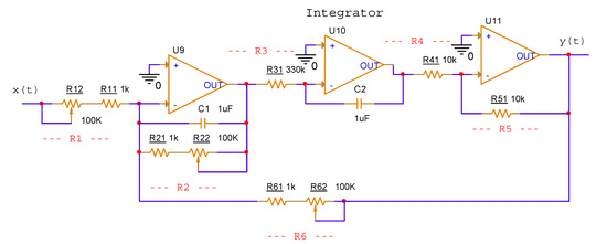 Higher-order circuits are created by cascading lower-order circuits. Figure 10 shows the schematic of a sample third-order circuit. The transfer function of the third-order analog circuit can be expressed as follows.