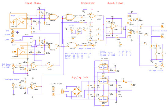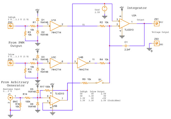 A schematic of a simplified version of the first-order simulator designed for an analog voltage range of 0 to 3 V is shown in Figure 13.
