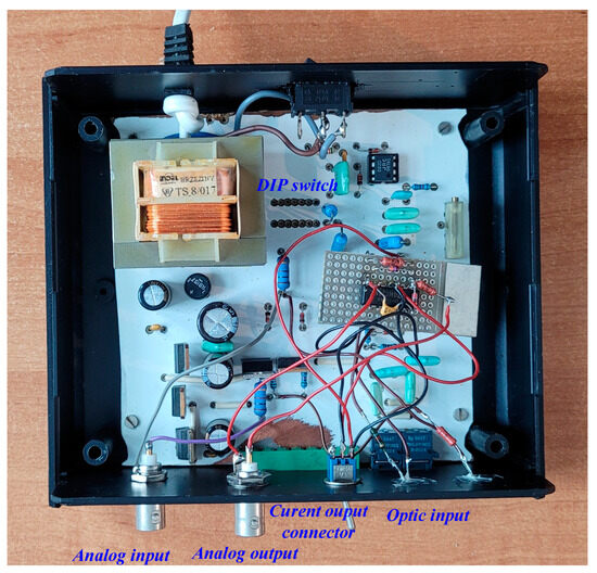 The author constructed three single-phase, first-order analog simulators designed for three-phase applications. The diagram and a detailed view of the proposed solution are presented in Figure 11 and Figure 12. The circuit incorporates two versatile fiber-optic receivers, U1 and U6 HFBR-2522Z from Micro-Semiconductor, Hong Kong, China, at the input; alternatively, binary inputs can be used.