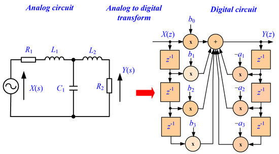 Figure 14 illustrates the process of converting a third-order analog circuit into a third-order digital circuit. The transfer function of the analog system is described by the equation: