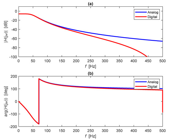 Figure 15 illustrates the frequency responses of the analog and digital circuits. Specifically, Figure 15a compares the magnitude frequency responses of the analog circuit and its digital equivalent, while Figure 15b presents their phase responses. The analog circuit exhibits a frequency response extending from zero to infinity, whereas the frequency response of the digital circuit is constrained to the range of zero to fs/2. Consequently, the characteristics of analog and digital circuits diverge, particularly near fs/2. As shown in the figure, the analog circuit demonstrates distinct behavior compared to its digital counterpart, with the differences becoming more pronounced as the frequency approaches fs/2. However, these discrepancies may be negligible if the sampling frequency fs and/or the power transistor switching frequency fc are significantly higher than the highest frequency component of interest.
