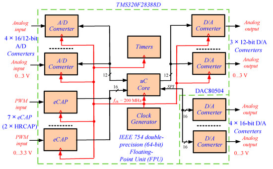 The block diagram of the proposed digital simulator is depicted in Figure 16. The microcontroller is equipped with four 16/12-bit A/D converters with simultaneous sampling and analog multiplexers at the inputs, allowing for the processing of more than four analog signals. For converting PWM signals into digital words, seven Enhanced Capture (eCAP) modules are utilized for duty cycle measurements of pulse train signals, with high-resolution capture (HRCAP) available on two of the seven eCAP modules. The output signals are processed by three 12-bit D/A converters. If there is a need to expand the number of outputs, an additional 16-bit D/A converter, specifically the DAC80504 from Texas Instruments, Dallas, TX, USA with an SPI interface, is used.