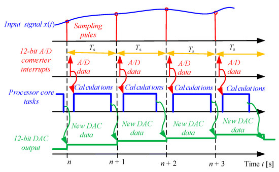 In the digital simulator system, proper signal sampling is essential. In the proposed solutions, a constant sampling period (uniform sampling) has been adopted. For the system with analog inputs and outputs, one of the microcontroller’s timers is utilized to generate sampling pulses that trigger the A/D and D/A converters. Upon completion of the conversion, one of the A/D converters generates an interrupt during which data are collected from the A/D converters and calculations are performed. Subsequently, new data are sent to the D/A converters. The entire process is executed within the interrupt service routine. The timing of the analog input for the digital simulator is shown in Figure 17.