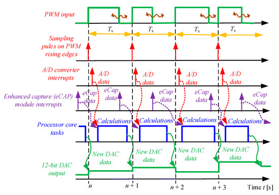 In the case of the simulator with a PWM input, it has been assumed that one of the PWM inputs triggers the A/D converters on the rising edge. Upon completion of the processing by the A/D converter, it generates an interrupt, during which data are collected from the A/D converters and the eCAPs, and all calculations are performed. Subsequently, new data are sent to the D/A converters. Interrupts from the eCAPs are also enabled in the microcontroller to transmit data regarding the PWM pulse widths. The timing of the digital simulator for PWM input is shown in Figure 18. In this configuration, the sampling period of the signals is equal to the period of the PWM signals. It is also assumed that the periods of the PWM signals are equal to one another.