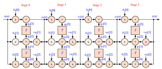 Block diagram of eighth-order IIR filter, cascaded connection of four second-order filter stages.