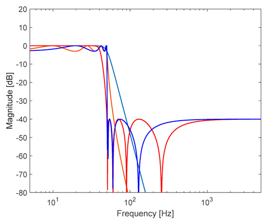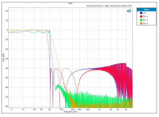 Subsequently, the implemented filters were tested in the test setup shown in Figure 19. The frequency response characteristics of the implemented filters are illustrated in Figure 22. As shown in the graph, an excellent match was achieved between the characteristics of the digital filters and those presented in Figure 21.