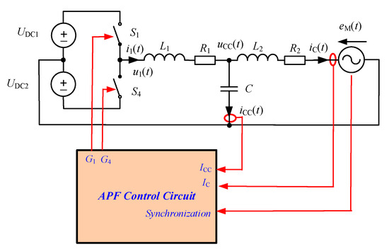 Simplified diagram of the single-phase output system of the Active Power Filter (APF) circuit.
