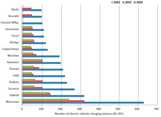 In analyzing the point infrastructure for hybrid and zero-emission vehicles, the uneven distribution of this infrastructure across Poland is noticeable. The study included 14 to 15 Polish cities, with Warsaw having the largest infrastructure of about 630 electric vehicle charging stations. It should be noted that in 2022, Warsaw had only 240 charging stations. Detailed data provided by PSNM regarding other Polish cities are shown in Figure 1. In the case of the cities of Koszalin and Opole, in 2022, there were no charging stations, while in Gorzów Wlkp, the charging stations were built in 2024.