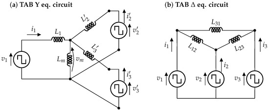 Considering the TAB structure in Figure 1, its equivalent circuit assumes the topology shown in Figure 2a. In particular, the equivalent circuit consists of a three-winding transformer, represented by the magnetizing inductance and the leakage inductance on each port . This transformer is supplied by three square-wave voltage generators characterized by a defined amplitude and frequency, where the phase displacements serve as the control parameters. The TAB model is developed by considering port no. 1 as a reference. Then, the prime symbol (′) is used, in the discussion, to define quantities reported to the reference port. Therefore, the parameters and the electrical quantities (currents and voltages) are referred to port no. 1 using (1), where : and : are the respective turns ratios.