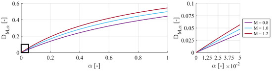 The analysis of the evolution of D vs. , parameterized with respect to M, as shown in Figure 3, highlights that the coupling effects associated with M variations are negligible for an value less than 0.05, producing a D variation that is less than 0.05. This result is particularly relevant in applications where master voltage variation occurs, as in the proposed case study.