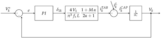 The definition of inner leakage inductance of MFT is the consequence of and L evaluation. The parameter is chosen initially equal to 0.05 in order to assure the decoupling condition. M is fixed initially equal to one referring to the battery-rated voltage for assuring the maximum TAB zero voltage switching condition extension. Hence, the inductance L can be evaluated for a defined switching frequency as reported in (24) as a function of the rated power and battery voltage. The parameter is the maximum phase shift value between ports one and two. The in DAB design is generally fixed lower than for optimising the current stress and efficiency [23]. In the proposed approach, the is set at following the linearization methodology. The proposed modelling allows the design of TAB controllers using linear theory. Considering the avionic standard constraints regarding the bus voltage variations, the DC bus voltages on the auxiliary and propulsion systems must be controlled to keep them constant. For this purpose, the parameter of the PI regulator can be synthesised for each output port referring to the block diagram reported in Figure 4 to achieve the desired bandwidth and rejection to load current disturbance, as follows: