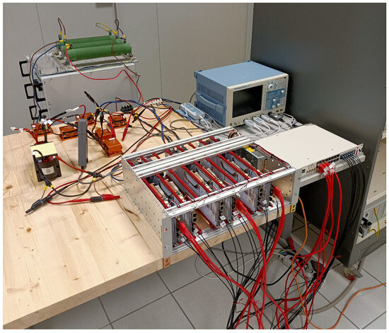 The main parameters of the three-winding transformer connecting the three active bridges are in Table 6. Four additional ferrite-based inductors are distributed on both the transformer output sides. In particular, two have a rated inductance of 50 H and a resistance of 0.1 each and are positioned on the transformer 1:1 output side. The two other inductors, having 12.5 H and 0.05 each, are installed on the transformer 1:0.5 output side. For the proposed configuration, is equal to 0.02; therefore, following the discussion in Section 2.3, the resulting D value is equal to 0.019, assuring the achievement of the quasi-decoupling condition. Figure 5 shows the developed TAB test bench. The following describes the developed TAB control strategy used for managing its start-up stage and output voltage control: