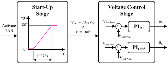 Figure 6 shows a schematic representation of the TAB control strategy. In order to overcome the occurrence of high inrush currents at the beginning of the modulation of the bridges, the start-up phase is necessary. The DC bus capacitors of both output active bridges are not charged. The output bridges act as simple rectifiers, while only the bridge connected to port no. 1 modulates in the start-up phase to limit inrush currents. In addition, to vary the duty cycle and hence the amplitude of the voltage impressed on the MFT, a phase shift is imposed between the two primary half-bridge modulation signals. In particular, is varied linearly in an open-loop state between 0° and 180° in a time interval of 0.273 s, allowing the transition of the duty cycle of the voltage from zero to 50%. Thus, the output DC buses are charged with limited currents. The output bridges of terminals no. 2 (propeller side) and no. 3 (auxiliary side) are ready for modulation when finishes its evolution.