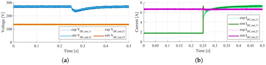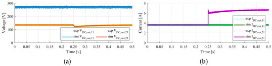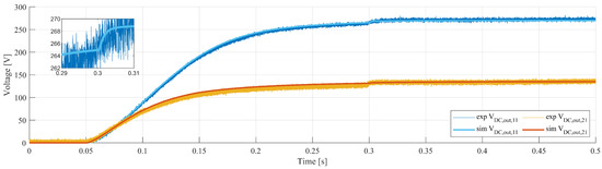 The simulation and experimental tests during the system start-up stage were performed to analyse the hard-switching conditions and their resulting inrush currents. In particular, during start-up, the DC buses of TAB ports no. 2 and no. 3 are charged from 0 to 270 V and 135 V, imposing an initial load of 243 and 60 , respectively. These load conditions correspond to a steady state power supply of 300 W for each TAB output port. In Figure 7, the simulated and experimental time evolutions of DC output voltages during start-up are shown, highlighting a good matching. In the upper left corner in Figure 7, a focus regarding the time instant in which the closed-loop voltage control is enabled is reported. The results confirmed the start-up procedure’s effectiveness because a small voltage compensation is required during the transient associated with voltage control enabling.