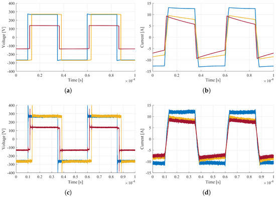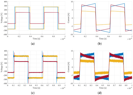 Subsequently, the analysis of TAB performances in steady state has been developed. In Figure 10, the voltage and current time evolution during two periods from both simulations and experimental tests are reported, considering a power demand of 1 kW on both output DC sides. In particular, in Figure 10a,b, the simulated waveforms are shown, while Figure 10c,d report the corresponding measurements of the experimental test. The blue waveforms are related to the transformer input side (port no. 1), the yellow ones show the propeller side (port no. 2), and the red traces show the auxiliary side (port no. 3). The comparison between the simulation and experimental results confirms a good overlap. In order to test the TAB behaviour for higher output power, simulations and experimental tests for a power demand equal to 2 kW on the propeller side and 1 kW on the auxiliary side were executed. Figure 11 presents the voltage and current waveforms from simulations and experimental tests. In particular, in Figure 11a,b the simulated signals are shown, while Figure 11c,d report the experimental ones. The blue waveforms are related to the transformer input side, the yellow ones represent the propeller side, and the red ones represent the auxiliary side.
