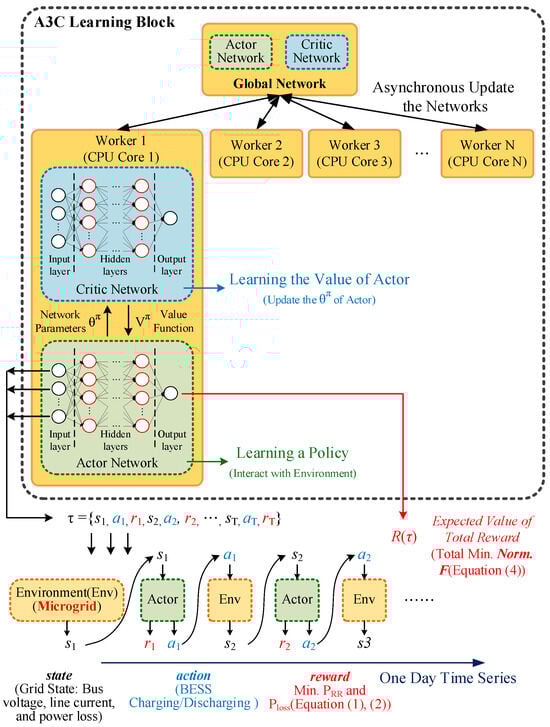 The A3C algorithm, a multi-threaded variant of the actor–critic method, is designed to enhance learning efficiency by reducing convergence time, broadening the search space, and addressing the issue of highly correlated samples typically collected by a single agent. On a multicore computer, each processor core operates a single A3C actor, enabling parallel interaction with the environment. Within the A3C framework, multiple actor agents interact simultaneously with independent copies of the environment, collecting diverse experiences that are subsequently used to train the model. The A3C learning framework for dispatching a BESS in a microgrid is illustrated in Figure 2, with parameter definitions provided in Table 1. The framework is described as follows: