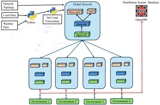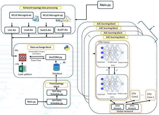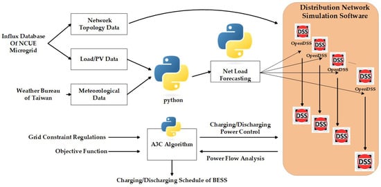 In the study by Huang et al. [18], a power system simulation platform was developed, as depicted in Figure 1. The original computing framework was designed as a single instance of OpenDSS to calculate power flow during each charging and discharging period of the BESS. In this framework, historical load data, measured from smart meters, are collected in the influx database of the NCUE microgrid, while meteorological data are sourced from the Central Weather Bureau of Taiwan. A Python-based load forecasting program was developed to analyze the data. Load and DER patterns stored in the database are converted into .csv files for further processing. The distribution network files are also converted into OpenDSS scripts (.dss) using a Python program, enabling time series power flow analyses (in 15-min intervals) in OpenDSS. OpenDSS, a distribution system simulator, supports the integration of DERs and facilitates microgrid operation studies. To optimize the energy management system, a Python-based optimization algorithm was created to interface with the OpenDSS model. This algorithm modifies network topologies and computes power flow, leveraging grid constraints and objective functions. The proposed A3C algorithm then calculates the optimal charging and discharging schedule for the BESS, ensuring a balance between power supply and load demand. This approach accounts for daily variations in weather conditions, enhancing the energy management of the NCUE microgrid.