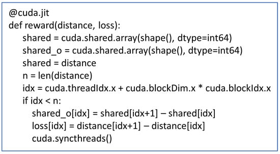 To accelerate the execution of the reward function in A3C [25], shared memory is utilized. For the reward function, which involves calculating the ramping rate, middle distance, and loss for each segment, the Numba CUDA kernel is presented in Figure 6. An empty array is first allocated to transfer the load data to the device side. The kernel is then invoked and executed on the GPU, with the results subsequently transmitted back to the host side. The kernel calculates the slope of each load segment, the distance of the average load, and the average loss value, leveraging shared memory for intermediate computations. By utilizing shared memory, the kernel minimizes reads from global memory, as each thread accesses the faster, on-chip shared memory instead. This approach significantly reduces execution time and improves overall computational efficiency.