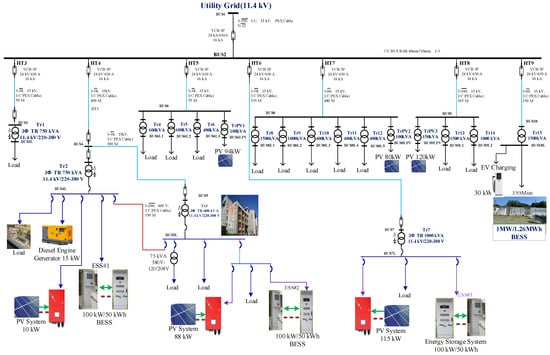 The dataset used in this study consists of two years of campus load data from the NCUE microgrid, spanning the period from 2020 to 2022, with a total of 61,249 records. The single-line diagram of the NCUE microgrid is presented in Figure 8. This microgrid includes distributed energy resources (DERs), a 1 MW/1.26 MWh battery energy storage system (BESS), photovoltaic (PV) systems, and loads, all of which are considered in the charging and discharging scheduling problem addressed in this paper.