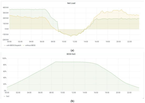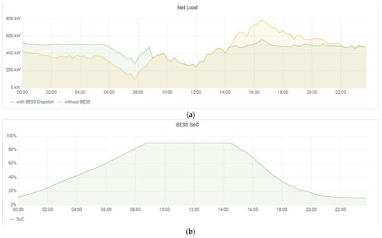 Before and after the BESS schedule results in an off-peak load day: (a) daily net load and (b) daily charging and discharging schedule.