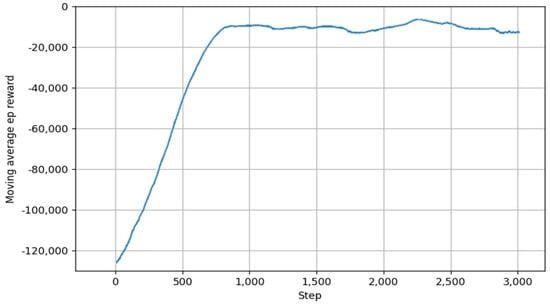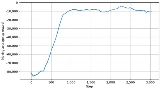The A3C learning process can be analyzed in terms of the global total reward by using the moving average of the rewards. Figure 12 and Figure 13 present the experimental results for different Ray cluster configurations. The results indicate that the 2-node Ray cluster reaches its local maximum reward at approximately 850 iterations, while the 3-node Ray cluster achieves its local maximum reward at around 1000 iterations. This performance difference is attributed to the 3-node cluster having more A3C actors than the 2-node cluster, as it contains a greater number of processor cores, with each core running one actor. The increased number of actors enables the 3-node cluster to explore more strategy spaces concurrently, improving learning outcomes.