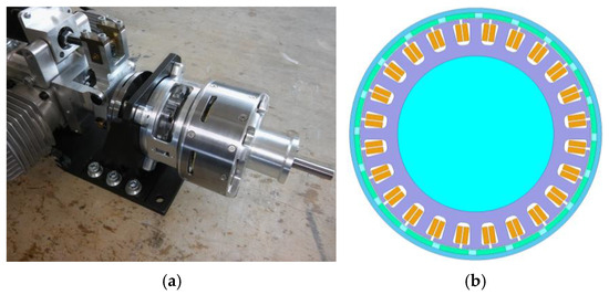 For the tests, a prototype brushless motor with permanent magnets (BLPMM) was used. The BLPMM construction was modelled for a small unmanned flying hybrid drive object (Figure 1a). A cross-section of the BLPMM is shown in Figure 1b.
