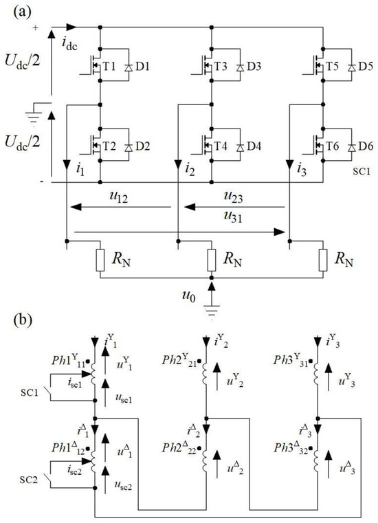 The present work [22] analysed the short-circuit condition of the partial winding for the tested construction. The results of the work were limited to an SC with an identical number of windings (two poles) for different motor winding configurations. It shows the waveforms of conductor currents, phase currents, short-circuit current, and electromagnetic torque. A proprietary method based on the detection of diagnostic frequencies included in the voltage signal u0 was used to detect the short-circuit condition (Figure 2a). It was shown that the method detected the SC state independently of the analysed winding configuration (star, delta, star/delta).