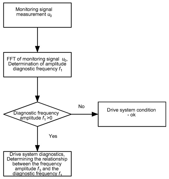 Figure 2a shows a system to monitor and diagnose the operating status of the BLPMM. The authors used the zero-voltage component (ZEV) method proposed for BLPMM fault detection [21]. The paper [21] used the voltage u0s that requires the availability of the neutral point of the motor as a diagnostic signal. This is an important limitation of this approach. In an article [22], the authors demonstrated that it is possible to diagnose BLPMM based on the u0. signal. This allows any BLPMM winding configuration to be used. In the article [22], it was shown that the FFT analysis of the diagnostic signal u0 allows for the monitoring and diagnosis of the operating state of the BLPMM. The value of the diagnostic harmonic is important. This is the first harmonic of the u0 signal: