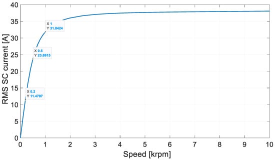 Under numerical calculation conditions, tests can be carried out under any condition. Laboratory tests significantly limit the possibilities of verifying numerical calculations. Under numerical conditions, the dependence of the RMS SC current was determined as a function of the rotational speed (with the SC1 key closed). The SC1 key short-circuits the two poles of the motor’s phase 1 (25% of the total number of coils). Figure 5 shows the results of the calculations.