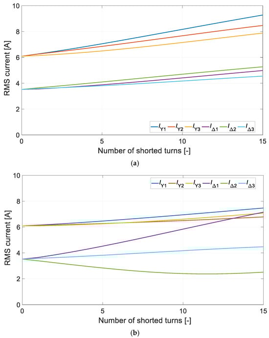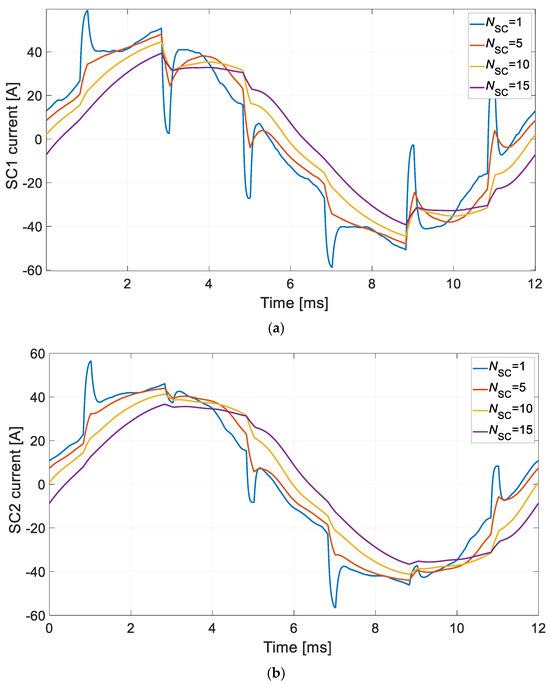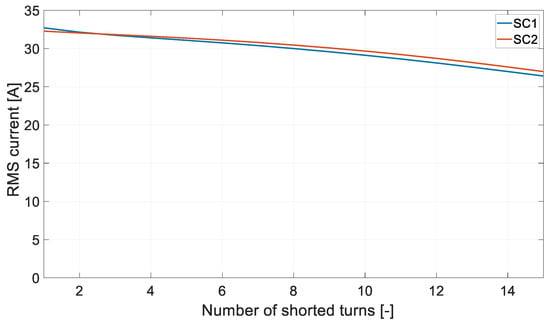 To determine the sensitivity of the proposed BLPMM monitoring and diagnostic method, a partial short circuiting of the coils was performed in the numerical model. From Nsc = 1 to Nsc = 15, the windings of a single pole were SC. The SC of one winding of the Nsc = 1 pole of the conventional Ph1 phase represents 0.83% of the total number of windings. The tests were carried out for SC1 and SC2. Figure 6 shows examples of short-circuit current waveforms for SC1 (Figure 6a) and SC2 (Figure 6b). The determined values of the RMS SC current as a function of the number of shorted Nsc windings are shown in Figure 7.