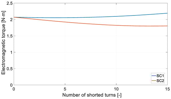 As can be seen, the two SC cases have different effects. However, the SC2 condition is more damaging. It not only induces the flow of a large short-circuit current; in the rest of the shorted winding, the phase current also increases significantly. This also affects the average electromagnetic torque Teav produced by the motor (Figure 9).