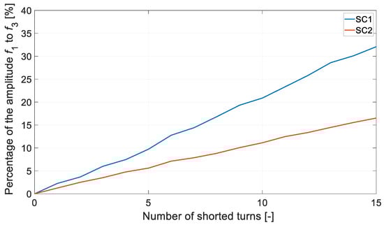 As can be seen, for a state of idle symmetry, the first, fifth, and seventh harmonics are missing. As the number of shorted Nsc coils increases, the amplitude of the first, fifth, and seventh harmonics increases. At the same time, the amplitude of the thirdrd harmonic decreases. Such trends are observed for both cases, i.e., SC1 and SC2. Increasing the number of coils decreases the difference between the amplitude of harmonic f3 and f1. This results in an increase in the amplitude of f1 relative to f3. Figure 12 shows the percentage of f1/f3.