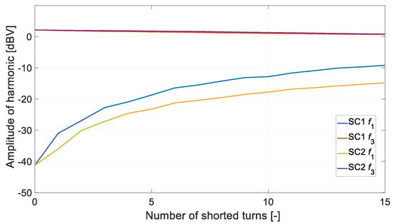 An FFT analysis of the diagnostic signal u0 was performed for all the cases analysed. The characteristic frequencies of the diagnostic signal u0 such as f1, f3, f5, f7, f9, etc., were determined. Examples of harmonic content distributions are shown in the paper [22]. The harmonic amplitude was determined for each frequency. The amplitudes determined for the diagnostic signal as a function of the number of shorted turns are shown in Figure 11.
