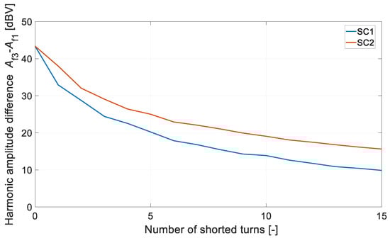 In the case of SC2, a single-turn short circuit results in a diagnostic harmonic f1 with an amplitude of 15.9 mV. This represents 1.25% of the amplitude of the harmonic f3. For the SC1 condition for Nsc = 1, the first harmonic represents 2.3% of the f3 harmonic. Theoretically, a single-turn short-circuit condition should be detected. In this case, if the amplitude of the diagnostic harmonic f1 exceeds 1% of the amplitude of the harmonic f3, this indicates the emergence of an asymmetrical condition. An asymmetric operating condition can be caused by the inclusion of a single turn. In fact, a similar effect can be caused by the internal asymmetry of the machine, e.g., different phase resistance values.