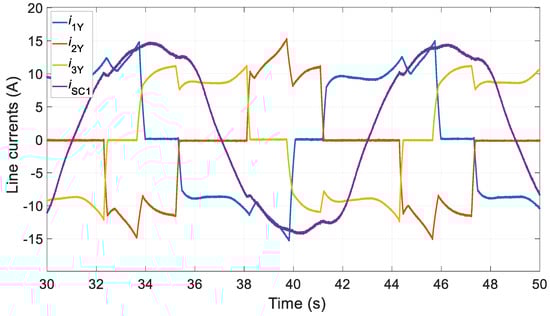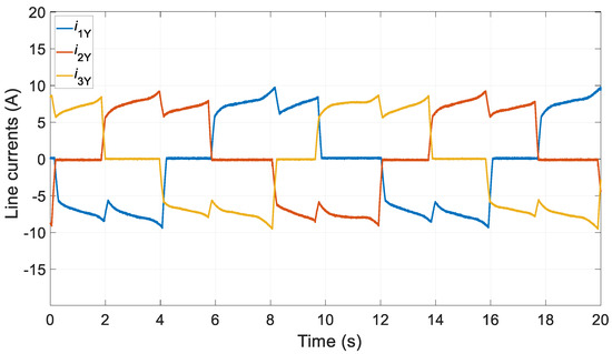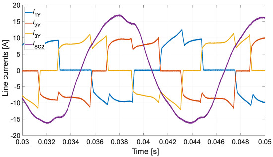 Laboratory verification was carried out under laboratory conditions. The waveforms of the conductor currents under symmetry conditions (Figure 15) and the two partial short-circuit winding conditions SC1 (Figure 16) and SC2 (Figure 17) were recorded for the operating point analysed.