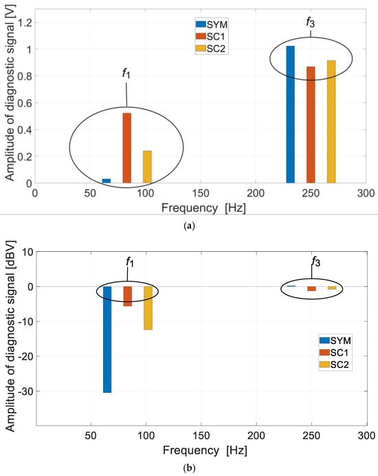 Under real-world conditions, achieving a difference between harmonics f3 and f1 of 40 dBV is not straightforward. In the laboratory test, a difference of 30 dBV was obtained. This indicates the existence of some problems in the operation of the drive system. This is due to two problems. The first is the control asymmetry. The second problem is the asymmetry in the execution of the machine itself. Both problems are reflected in the diagnostic harmonic f1. They cause an increase in the amplitude of the harmonic f1. This affects the sensitivity of the analysed method. At the same time, the tests carried out clearly indicate that the detection of the SC2 state is more difficult (lower sensitivity of the method). This fully confirms the results of the numerical calculations.