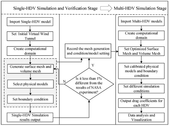 Our hybrid methodology is composed of two consecutive and interconnected phases: single-HDV simulation validation and multi-HDV platooning simulation. The initial phase involves the validation of a single HDV CFD simulation using a generic conventional HDV model (vehicle model details are provided in Section 2.1), strictly adhering to NASA’s experimental criteria for wind tunnel configuration and vehicle placement. The finite volume method is applied to generate the mesh, with careful optimization of mesh sizes and structures. Appropriate physical models are selected, and boundary conditions are defined. Through iterative optimization and continuous comparison with NASA wind tunnel data, we minimize errors to below 1%. This validation establishes the reliability of the single HDV simulation model.