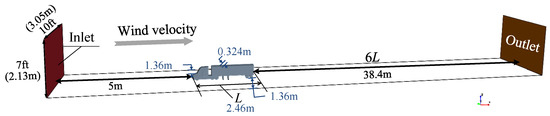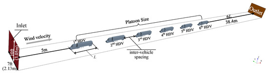 The virtual wind tunnel has a cross section of 7 ft (height) × 10 ft (width) (2.13 m × 3.05 m). The length of the virtual wind tunnel varies depending on the number of HDVs in a platoon. For a wind tunnel containing only one HDV, the length of the tunnel is 22.2 m. When a platoon contains multiple HDVs, the virtual wind tunnel is extended to cover all the platooning HDVs in series. It is noted that an inter-vehicle space is provided between any two consecutive HDVs. The space between the wind tunnel’s inlet and the first platooning HDV remains 5 m. Similarly, 6 L is reserved for the space between the rear end of the last HDV to the outlet of the wind tunnel.
