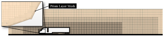 Mesh structure of a single HDV in the virtual wind tunnel. Longitudinal section of the mesh structure for a single HDV. Three layers of volumetric meshes exist in the wind turbulence domain. A prism layer consisting of dark and denser meshes is applied on the HDV surface. An enlarged area of the prism layer provides the prism’s configuration in detail. The computational domain mimics the virtual aerodynamic space of an HDV driving on a dedicated truck lane.