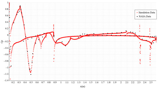 To further validate the accuracy of the CFD simulations, we tapped a set of sensors in the computational domain and compared the static relative pressures (or the virtual Cp values) obtained from these sensors to those within the NASA wind tunnel tests (or the NASA Cp values). Figure 5 illustrates the Cp distributions of these sensors along the testing HDV, with 0° yaw. The HDV was positioned at x = 13.33 cm, and the rear end of the HDV was at x = 259.39 cm. Visually, the virtual Cp values were consistently close to the NASA Cp values. The root mean square error (RMSE) between the two sets of Cp values was 0.0394, which indicates an excellent match between the two settings for the wind tunnel experiments.
