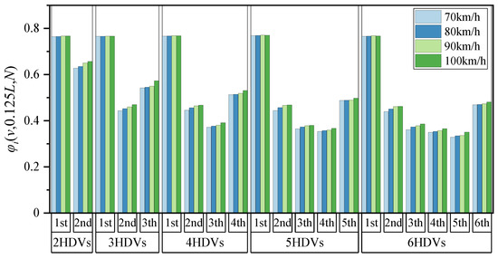 φi(v, D, N) in a platoon at various speeds with an inter-vehicle spacing of 0.125 L.