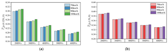 The influence of HDV speed on the average aerodynamic drag coefficient of a platoon varies across different scenarios. Figure 8 illustrates the impact of HDV speed on the average aerodynamic drag coefficient for different platoon sizes at inter-vehicle spacings of 0.125 L and 1.5 L. The results demonstrate that the influence of speed is more pronounced at smaller inter-vehicle spacings. Specifically, at 0.125 L, the relative extreme ranges of the average aerodynamic drag coefficient across different speeds ranged from 3.58% to 4.80%. When the inter-vehicle spacing is expanded to 1.5 L, this range narrowed to [0.91%, 1.30%]. Additionally, at inter-vehicle spacings of less than 0.5 L, increasing the speed from 70 km/h to 100 km/h results in a 2.77–4.92% increase in the average aerodynamic drag coefficient of the platoon, with this trend becoming more pronounced as the platoon size increases. This indicates that HDV speed is a significant factor in influencing aerodynamic drag under the conditions of smaller inter-vehicle spacings or larger platoon sizes. However, when the inter-vehicle spacing exceeds 1 L, or when the inter-vehicle spacing is greater than 0.5 L and the platoon size is less than five HDVs, the impact of HDV speed on aerodynamic drag can be considered negligible.