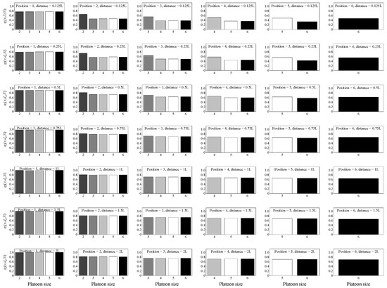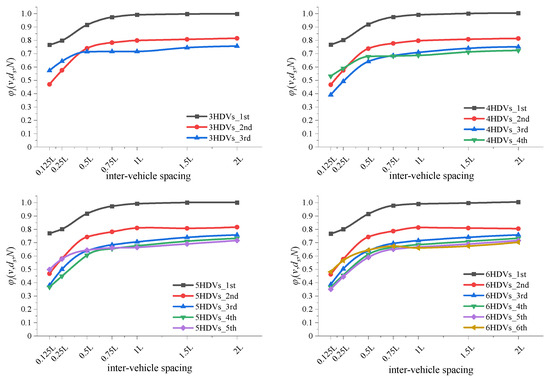 This study examines platoon sizes ranging from 2 to 6 HDVs. Figure 13 provides the φi(v, ds, N) of HDVs within a platoon at 90 km/h. It describes a set of 42 cases (seven inter-vehicle spacings (0.125 L, 0.25 L, 0.5 L, 0.75 L, 1 L, 1.5 L, and 2 L) with six platoon sizes (two HDVs, three HDVs, four HDVs, five HDVs, and six HDVs)). The horizontal axis in each case represents the platoon size, while the vertical axis shows the φi(v, ds, N) values. Each row in this figure represents φi(v, ds, N) at a specific inter-vehicle spacing, while each column denotes the positions of the platooning HDVs. For instance, the top-left case illustrates the φi(v, ds, N) values of the second HDV in a platoon ranging from two to six HDVs, with an inter-vehicle spacing of 0.125 L.