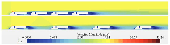 This peculiar behavior results from the fact that, when inter-vehicle spacings are reduced, the following HDV enters the low-pressure region formed by the wake of the leading HDV. This interaction markedly reduces the pressure differences between the adjacent HDVs, resulting in a decrease in φi(v, ds, N). Conversely, when the inter-vehicle spacing increases, the following HDV transitions from the low-pressure wake region of the leading HDV. This shift results in a decrease of the slip-streaming effect and an intensification of dynamic pressure (directly proportional to the square of the fluid’s velocity) for the trailing HDV. Consequently, the drag-reducing influence of the wake on the trailing HDV is significantly diminished, leading to the higher φi(v, ds, N) value. Figure 11 illustrates the slip-stream effect in a four-HDV platoon at the inter-vehicle spaces of 0.25 L and 1.5 L.