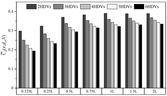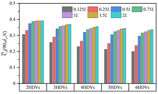 Figure 9 highlights the variations of φi(v, ds, N) under different inter-vehicle spacings for an HDV–HDV platoon. As the inter-vehicle spacing increases, the aerodynamic drag coefficients of both HDVs increase. Additionally, the trailing HDV experiences a φi(v, ds, N) lower than the leading HDV because the leading HDV shields the trailing HDV from a significant portion of the oncoming flow, resulting in a notable reduction of aerodynamic drag in the trailing HDV. Furthermore, the trailing HDV’s aerodynamic performance is particularly sensitive to changes in the inter-vehicle spacing. As the inter-vehicle spacing increases from 0.125 L to 0.75 L, the φi(v, ds, N) rises. When the inter-vehicle spacing is at 1 L or more, the leading HDV’s aerodynamic drag matches the baseline case (with a single HDV), while the trailing HDV experiences a reduction of φi(v, ds, N), approximately 20% compared to the baseline case.