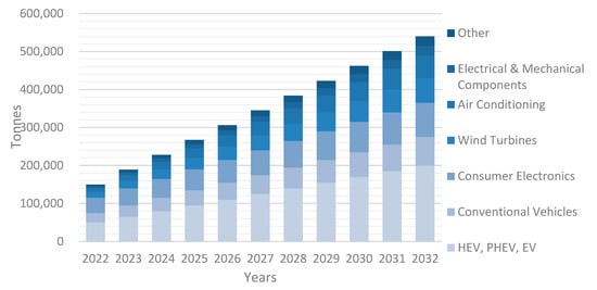 Projected NdFeB magnet consumption by application segment (2022–2032) [].